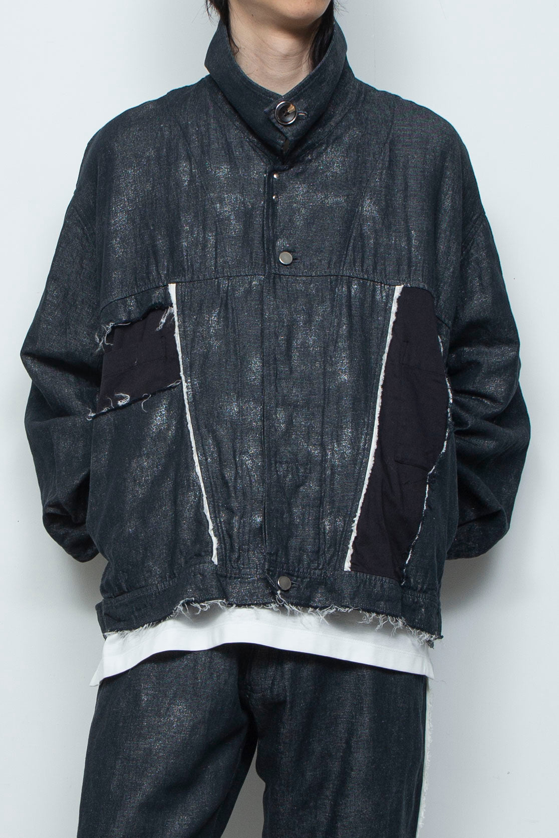フレンチリネン×コットンのナチュラルなデニム+原反箔プリントのオリジナル素材を採用した、再構築カーペンタージャケット。