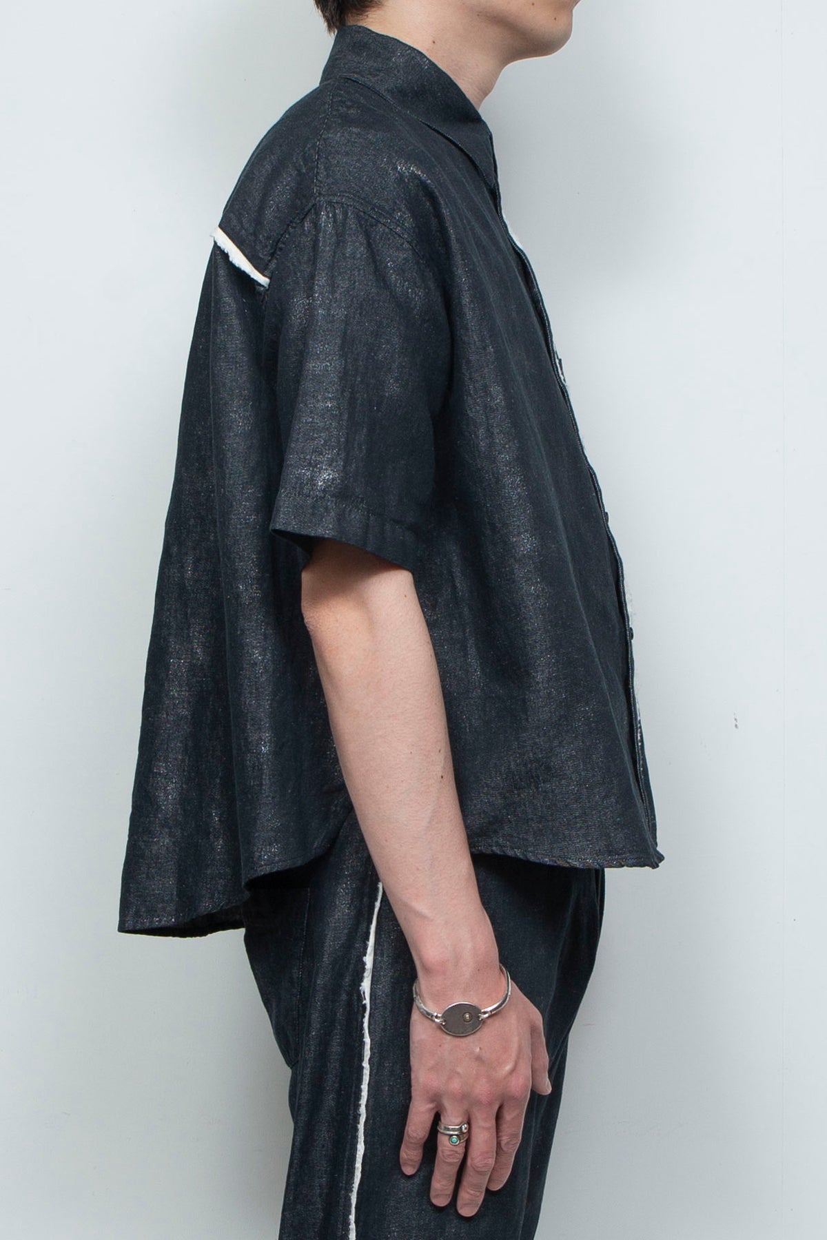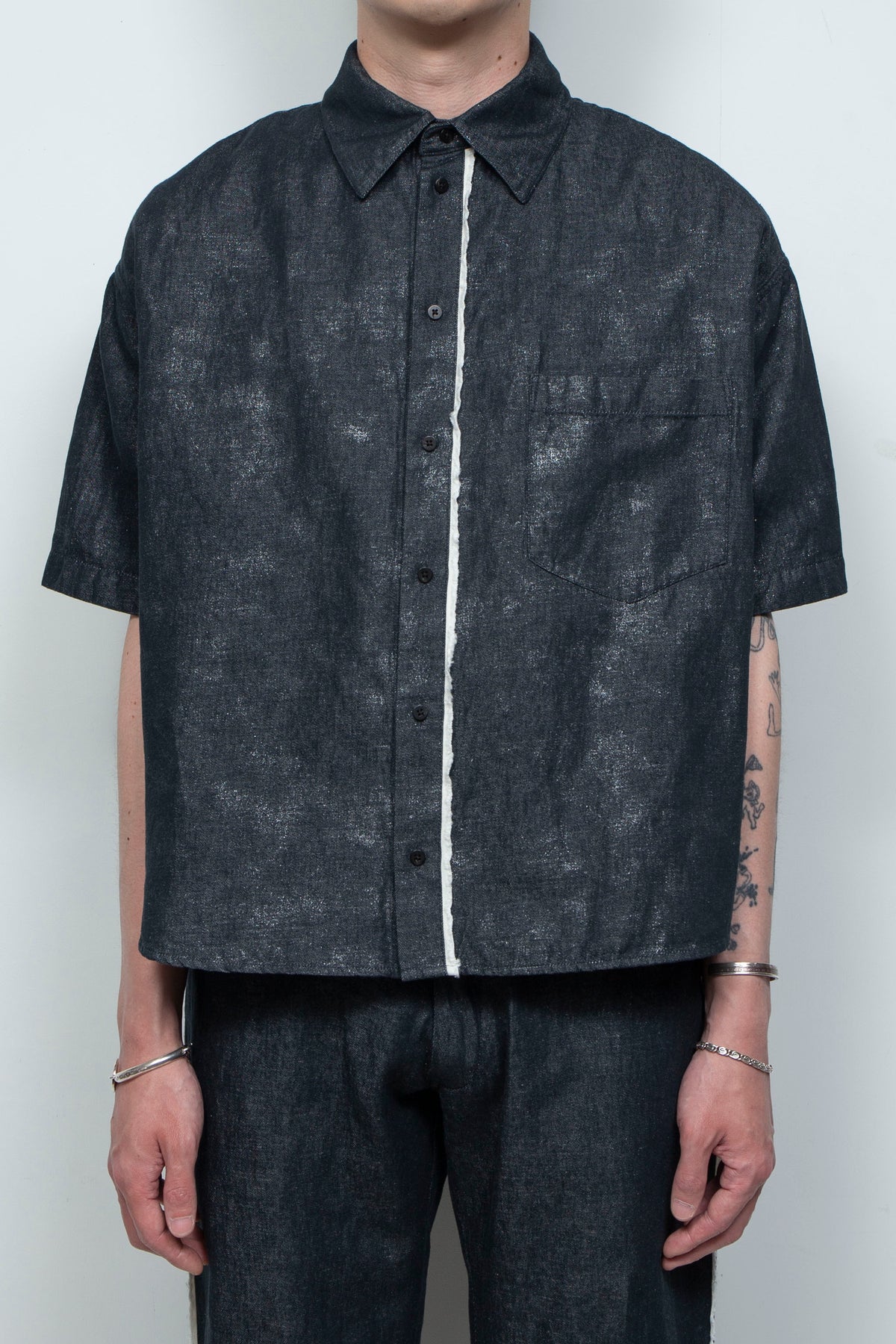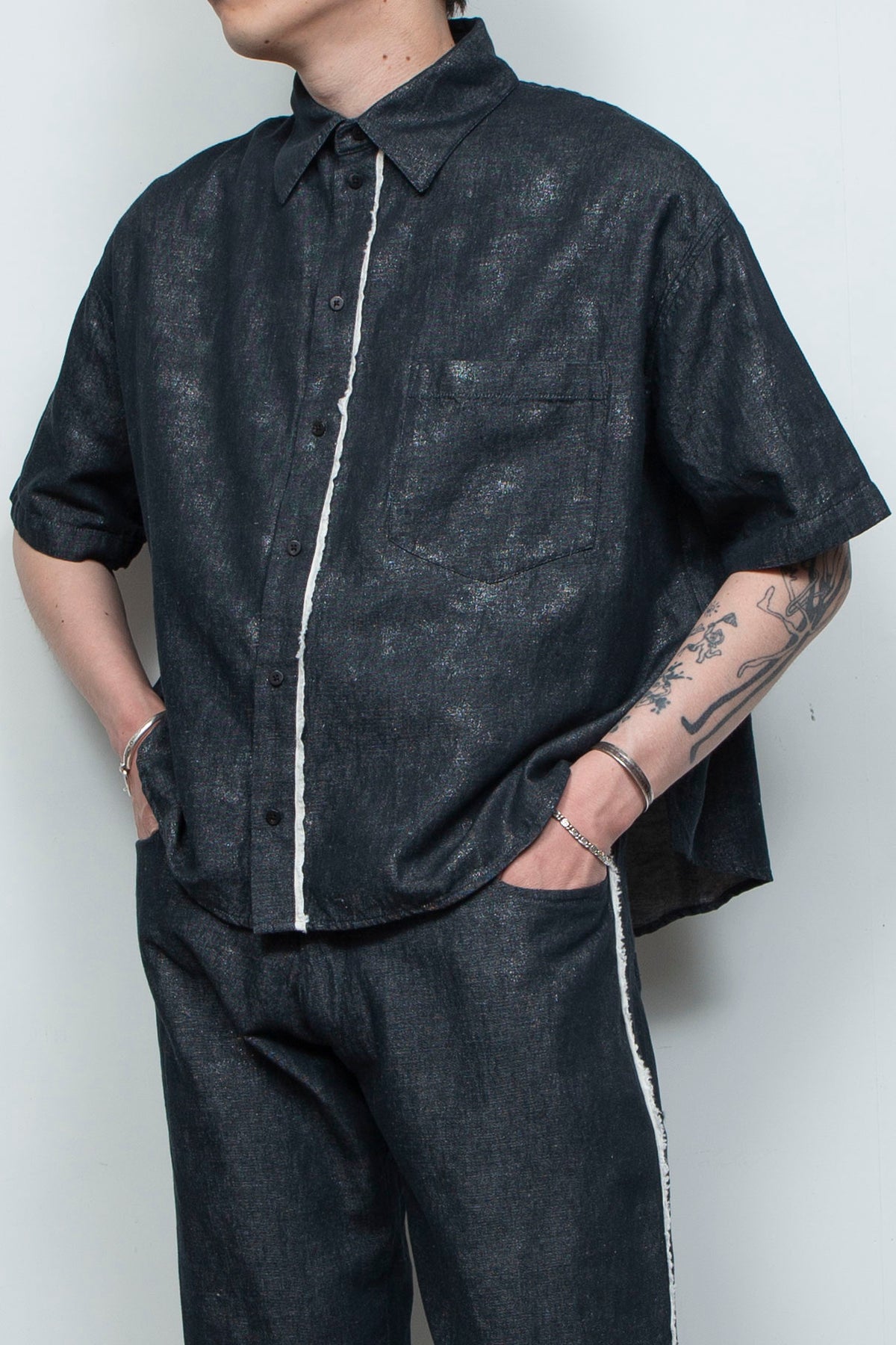 フレンチリネン×コットンのナチュラルなデニム+原反箔プリントのオリジナル素材を採用した、新作ショートスリーブコンパクトシャツ。