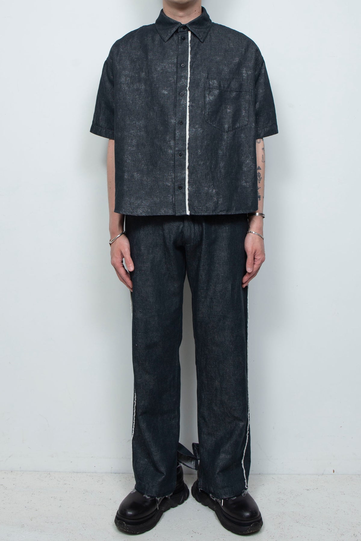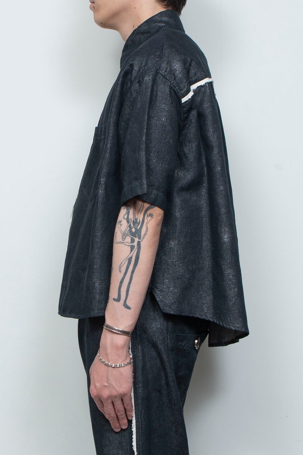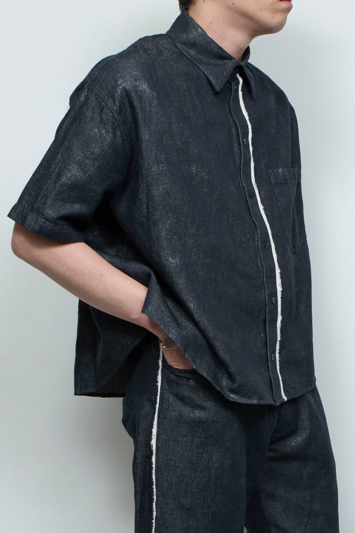 フレンチリネン×コットンのナチュラルなデニム+原反箔プリントのオリジナル素材を採用した、新作ショートスリーブコンパクトシャツ。