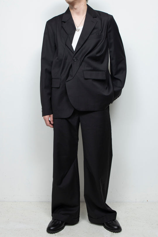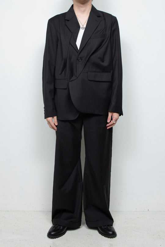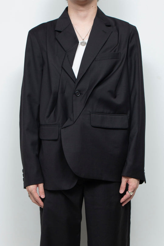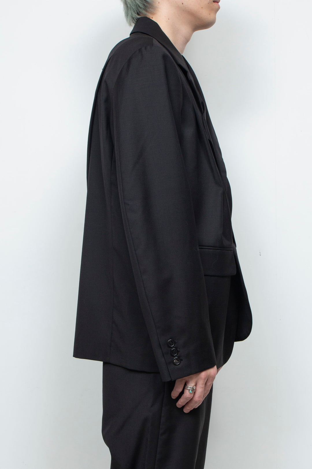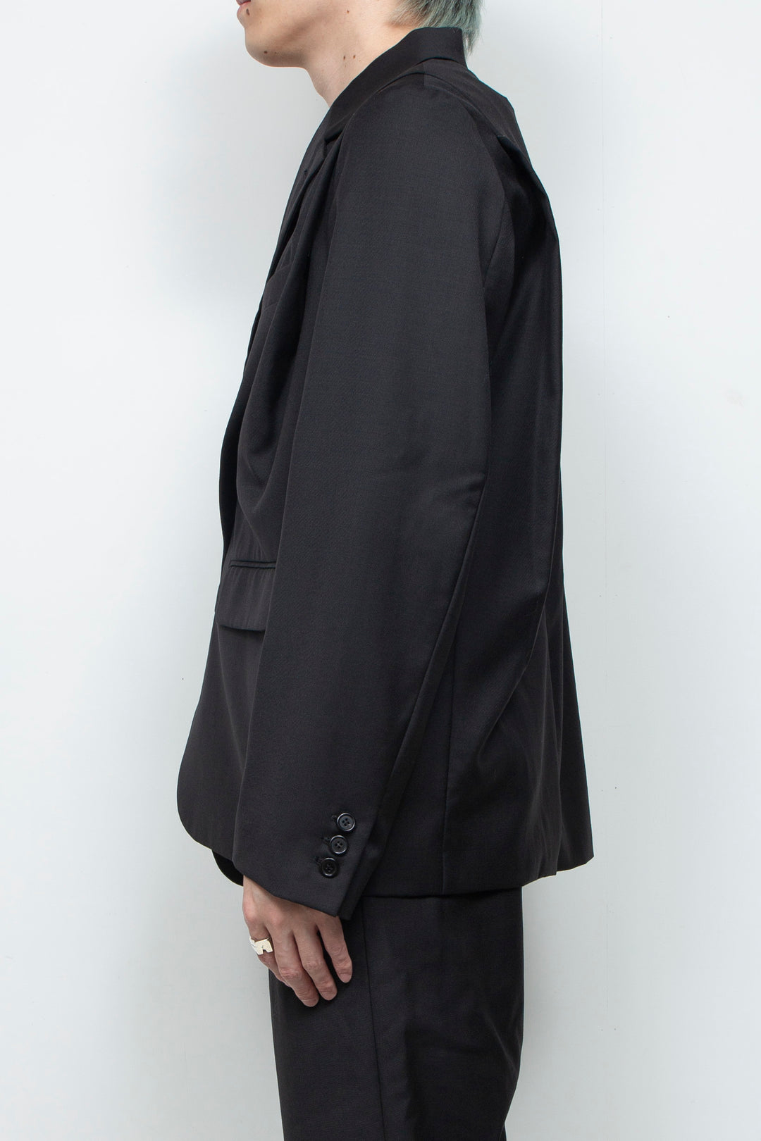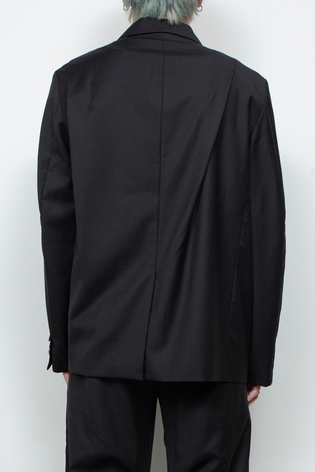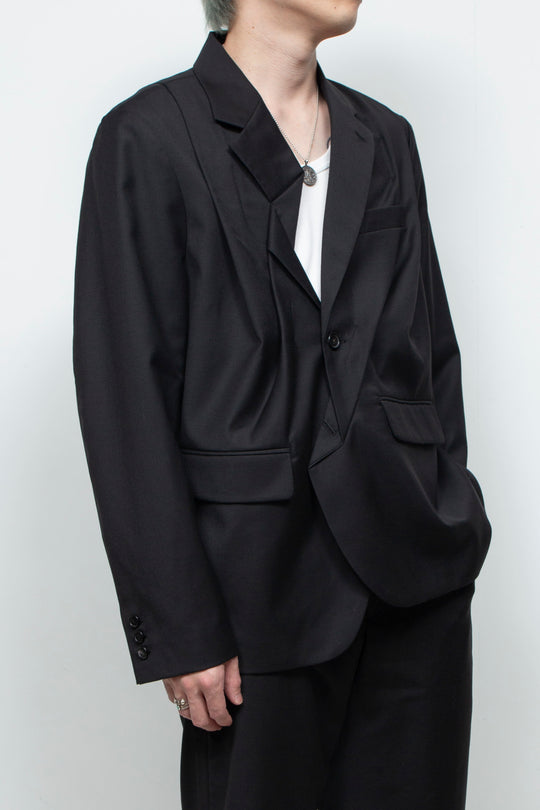 シングルボタン仕様で、第二ボタンは飾りとして配置。シャープな印象ながらも、立体的なタックがアクセントとなり、デザイン性も兼ね備えた一着です。