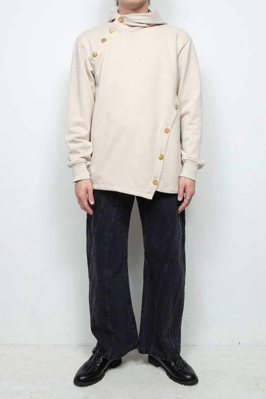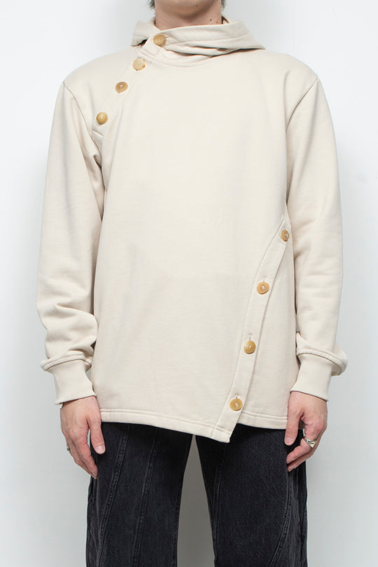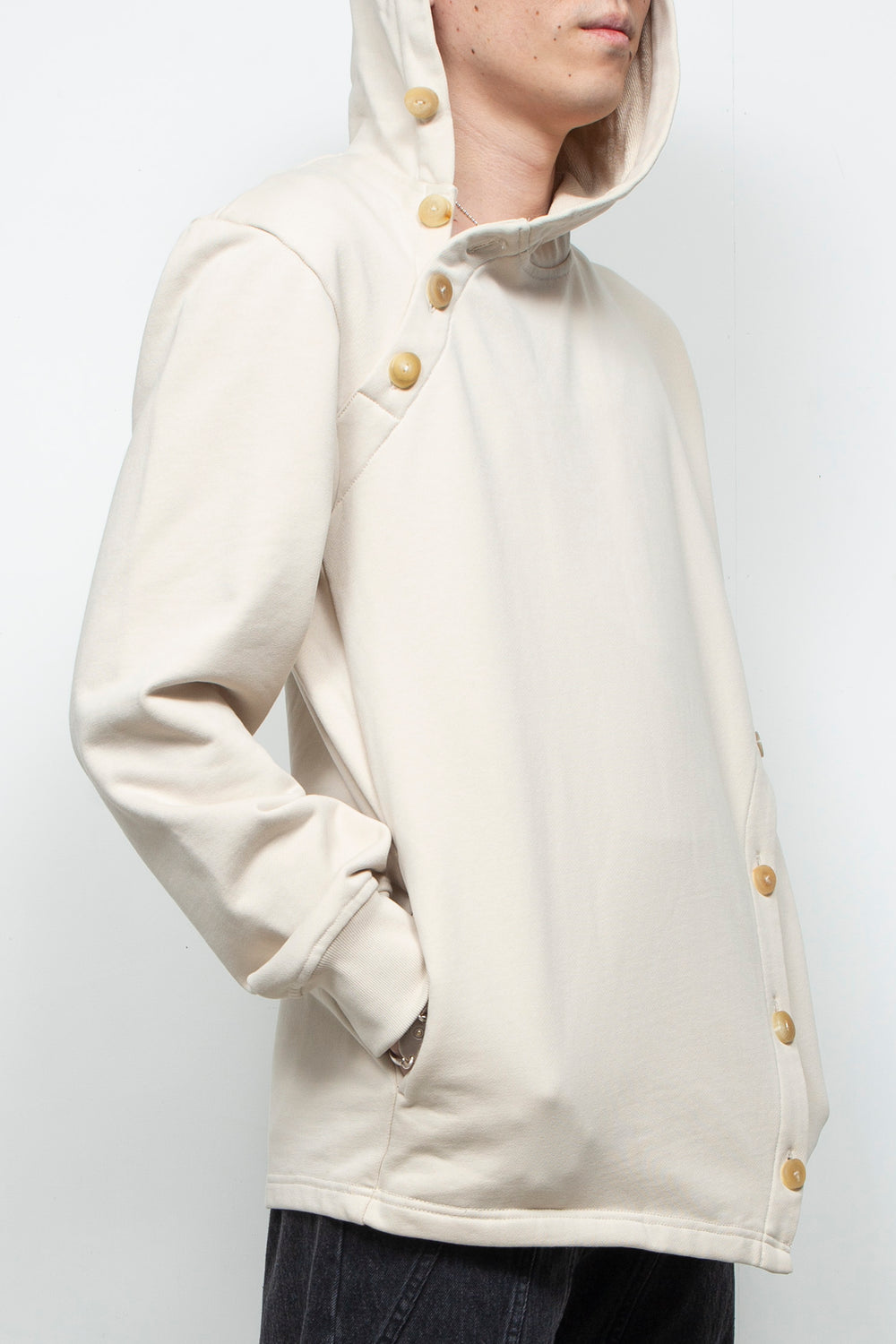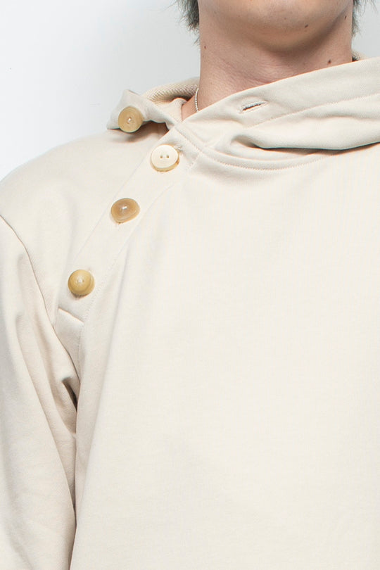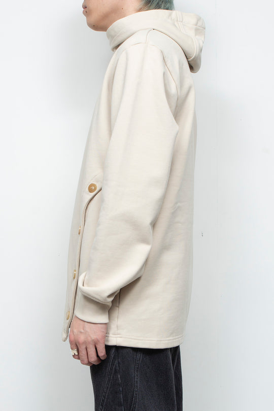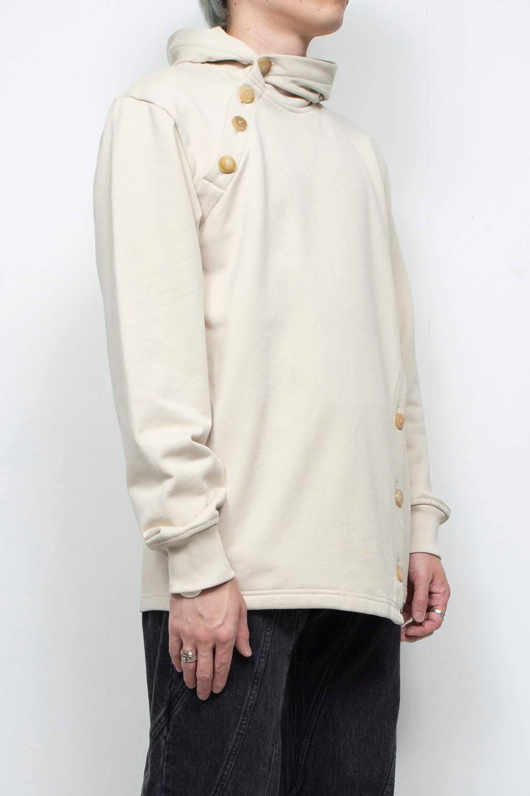 フードはツイストさせたデザインで、本水牛の厚みのあるボタンを採用し、開閉が可能。