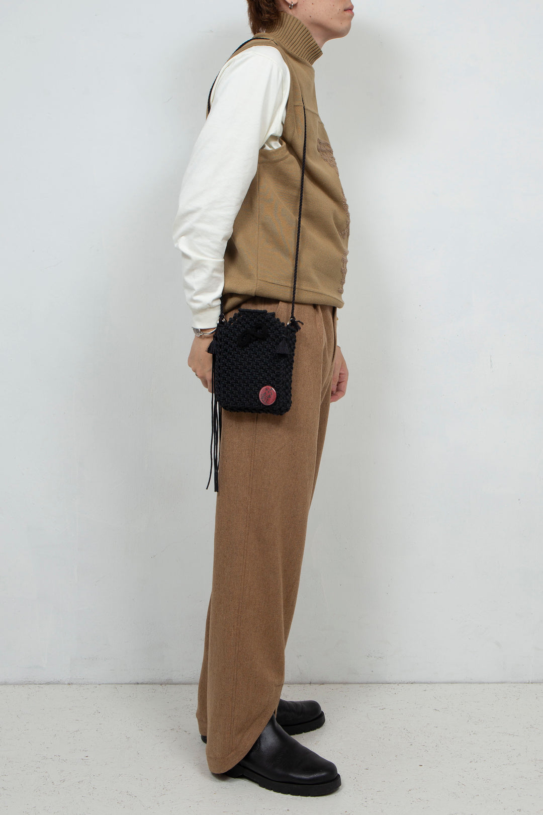 二重叶結びした紐と形をお守りからインスピレーションを受けた手編みのバッグ。肩紐は調整可能です。
