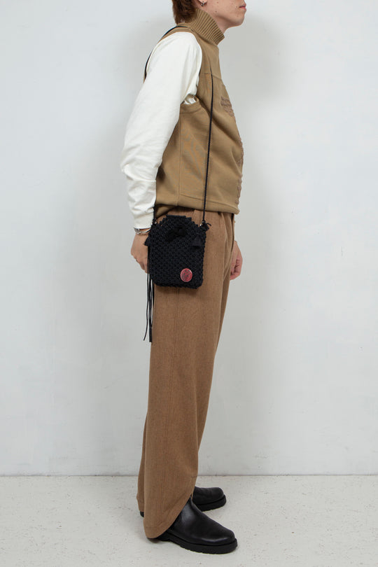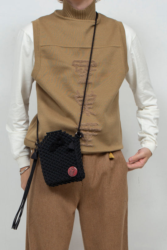 A hand-knitted bag whose double knotted string and shape are inspired by amulets. The shoulder straps are adjustable.