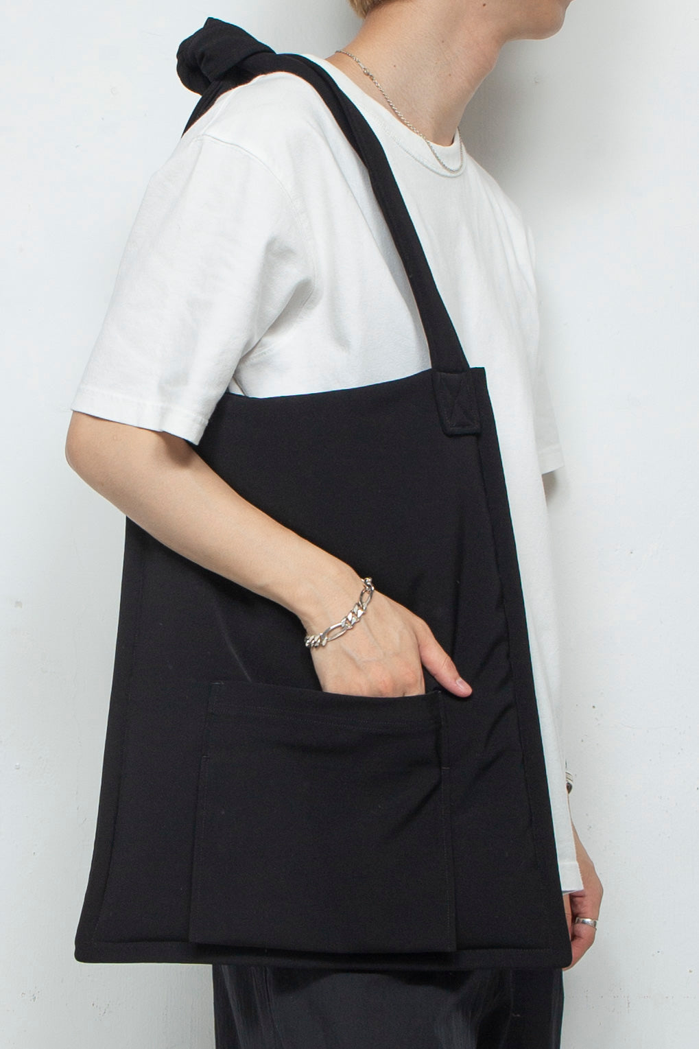 持ち手が長くなっており、斜め掛けはもちろん、結んでショルダーバッグとしてもお使いいただけます。