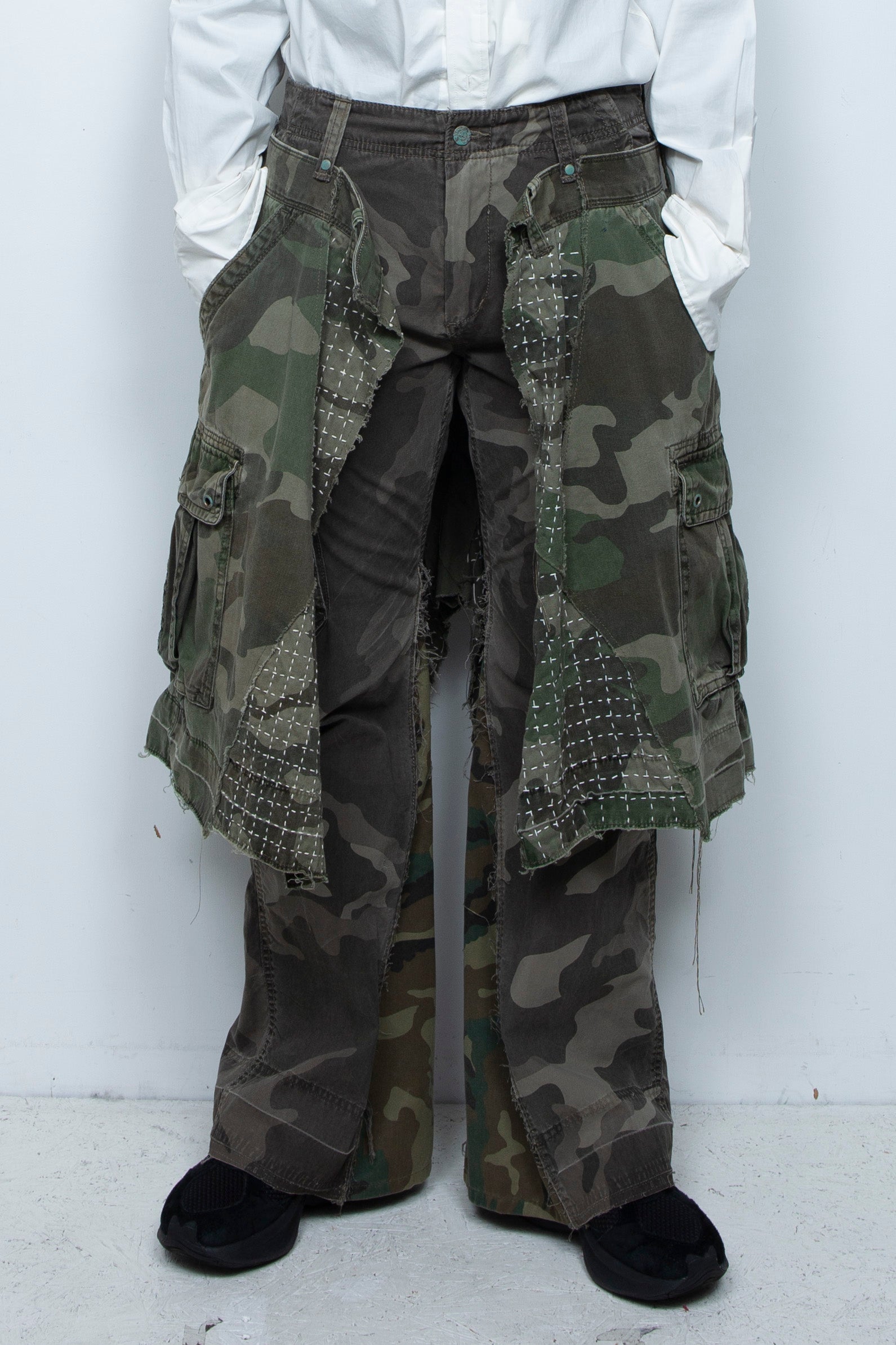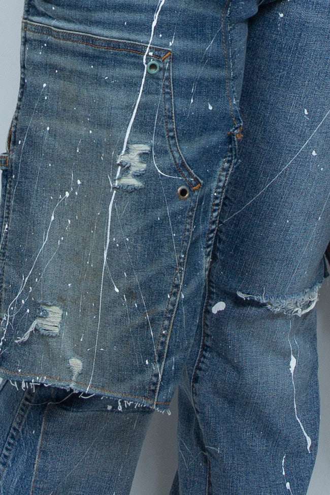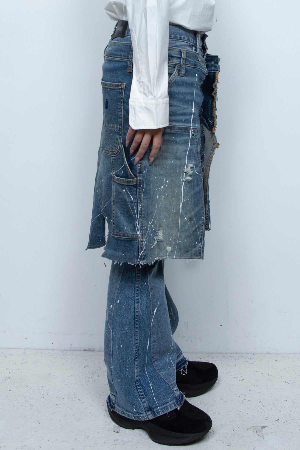 2種類のデニムを使用し、土台のデニムの上にペインターデニムをラップスカート風にレイヤードし、一着で完成されたアイテム。