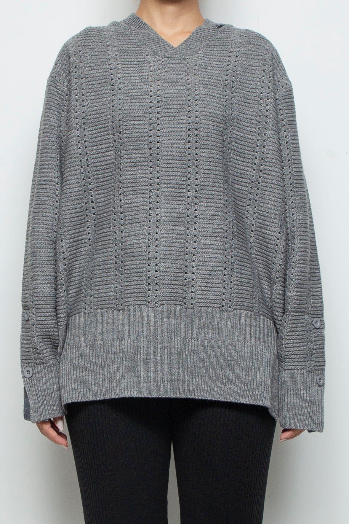 袖の切り替えが特徴的なボタンでスリットが開閉できるニットトップス。