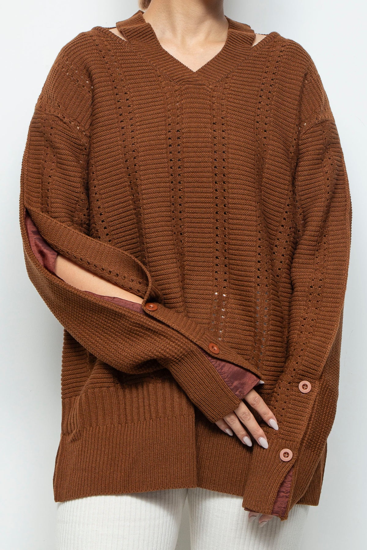 袖の切り替えが特徴的なボタンでスリットが開閉できるニットトップス。