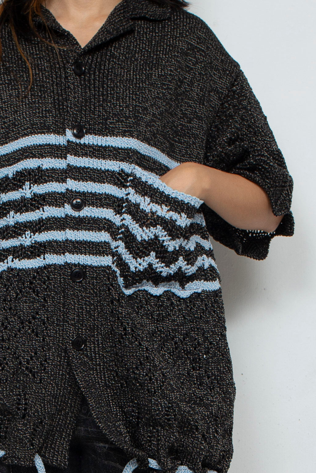 オリジナルの糸を使用し、袖の丸みや袖先のギザギザなどざっくりとした編み地で表現したニットシャツ。変則的なボーダー柄で、裾には紐を編み込んでいます。洗濯可能。