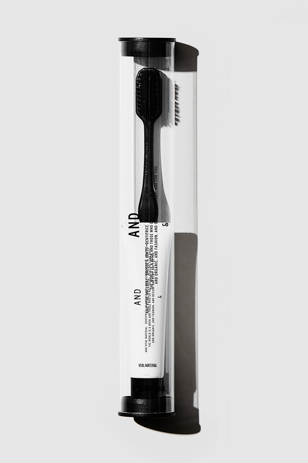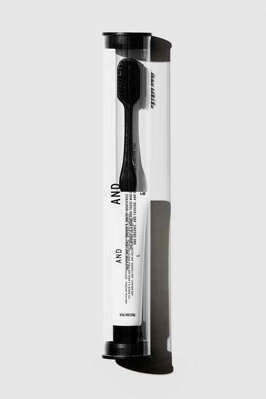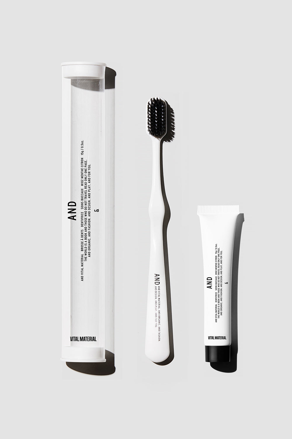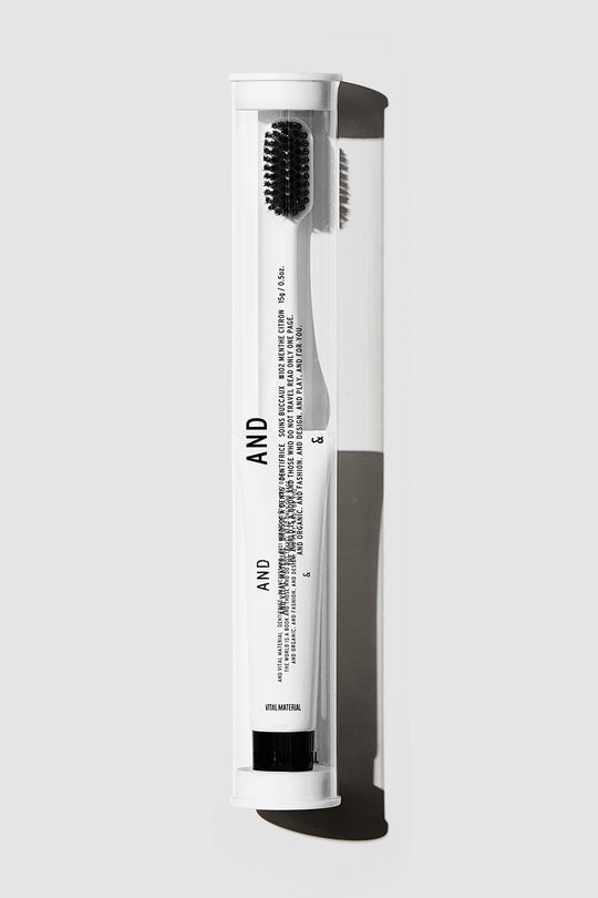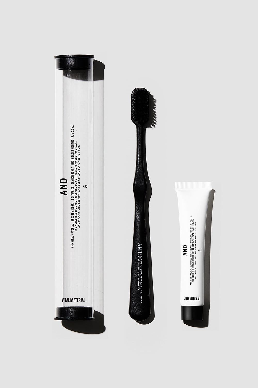 ハーブミントタイプの歯磨き粉と、トレンドのデカヘッド歯ブラシがセットになったトラベルセット。