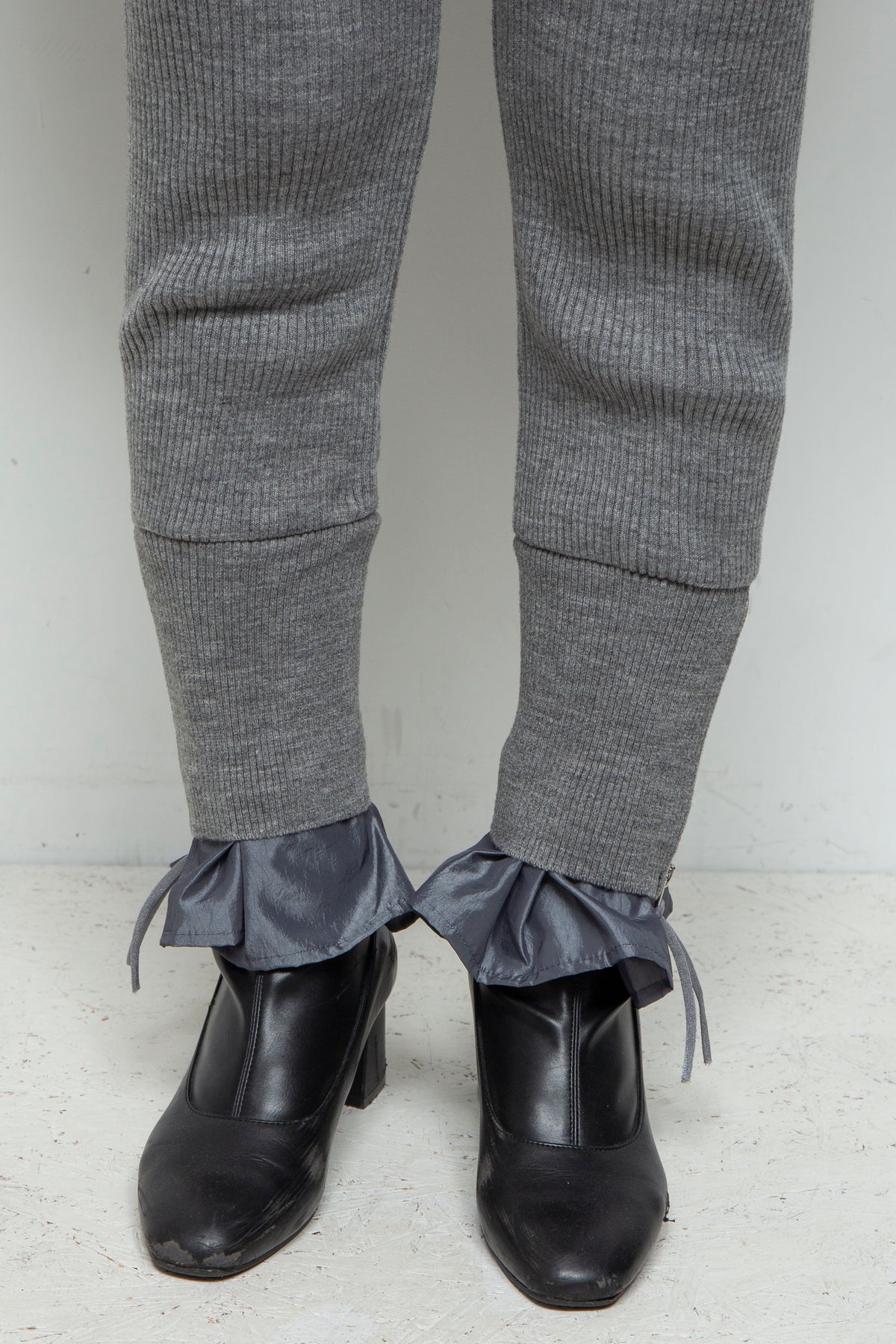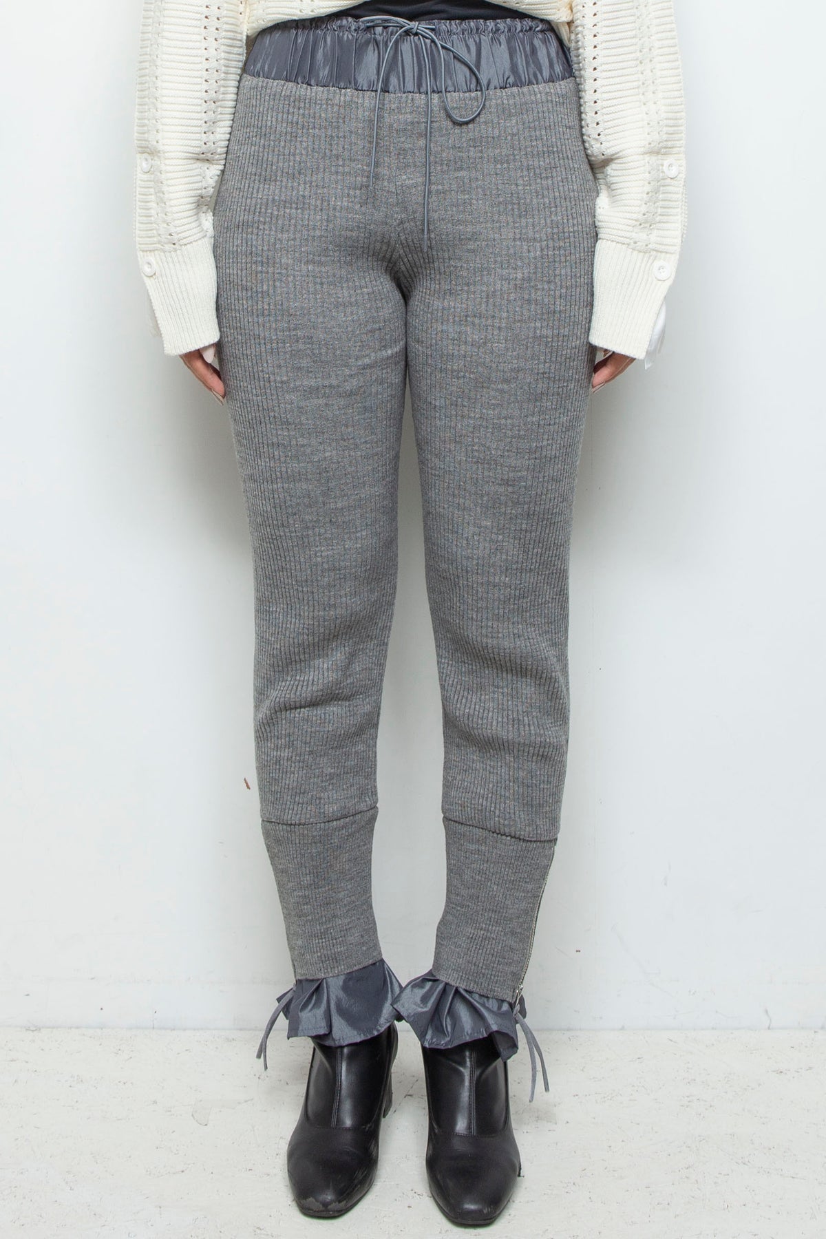 ウエストと裾の素材切り替えが特徴的なリブパンツ。