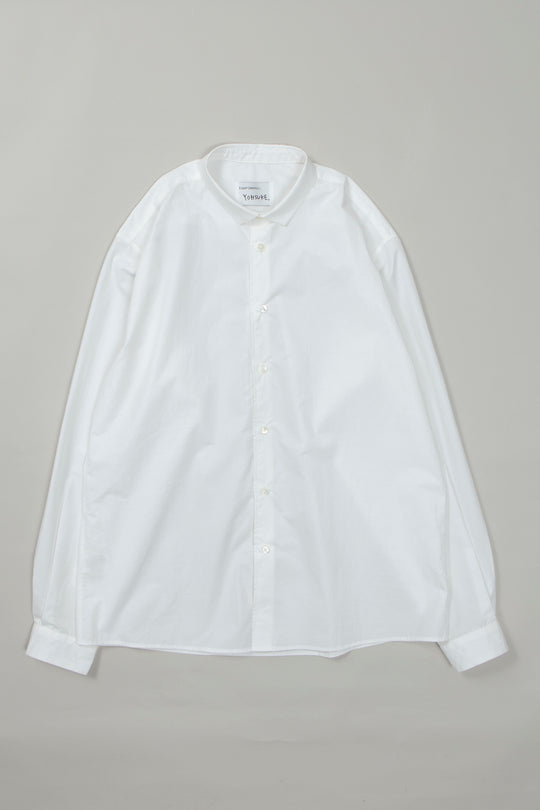 洋服作りを始めたころからさまざまなシャツを解体し、構造を研究して、それぞれ惹かれるところを落とし込んだ衿やカフスが小さめのシンプルなシャツです。 コットン100%タイプライター80Sの生地でボタンは生成の貝ボタンを使用。