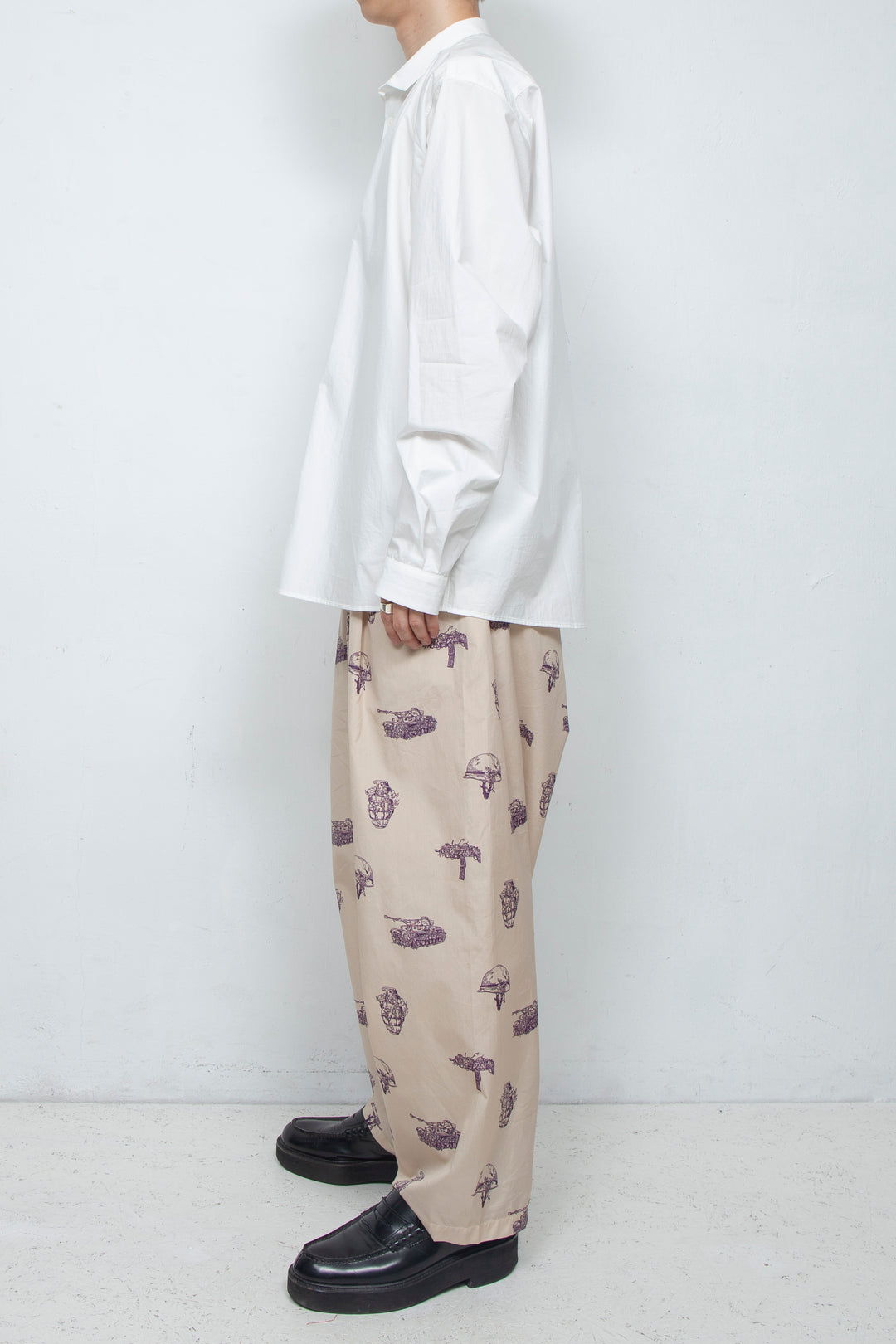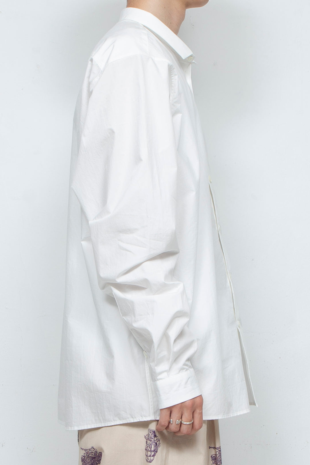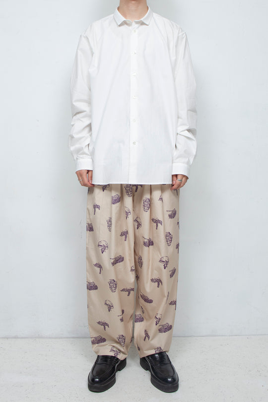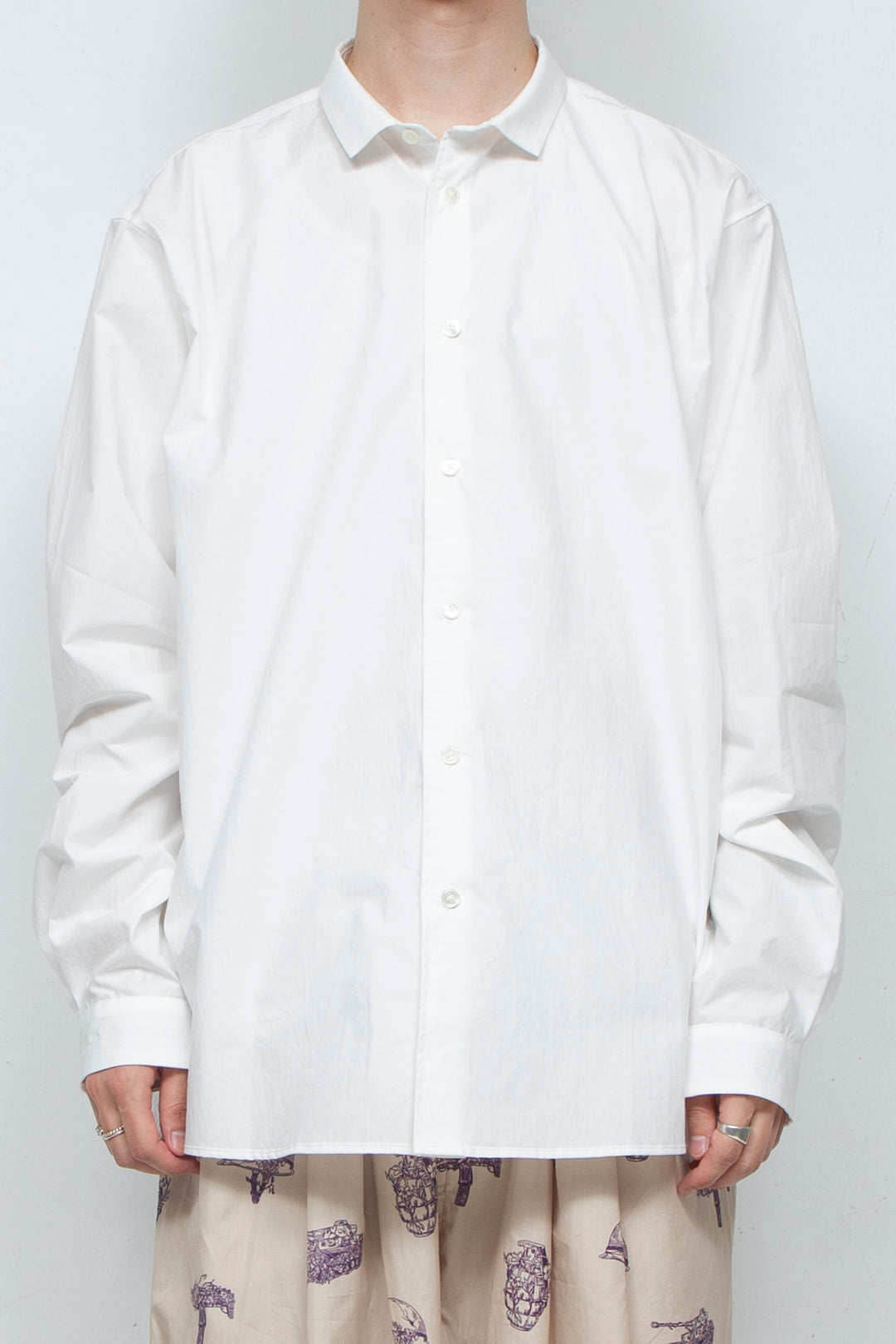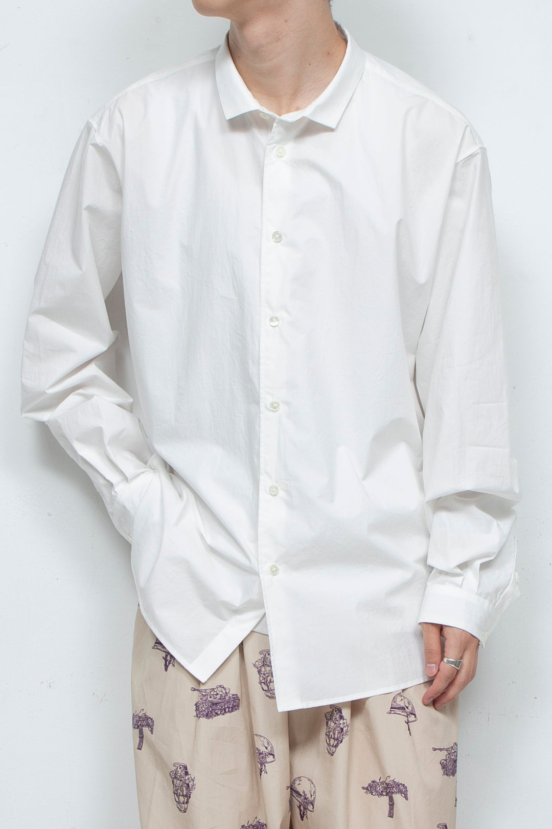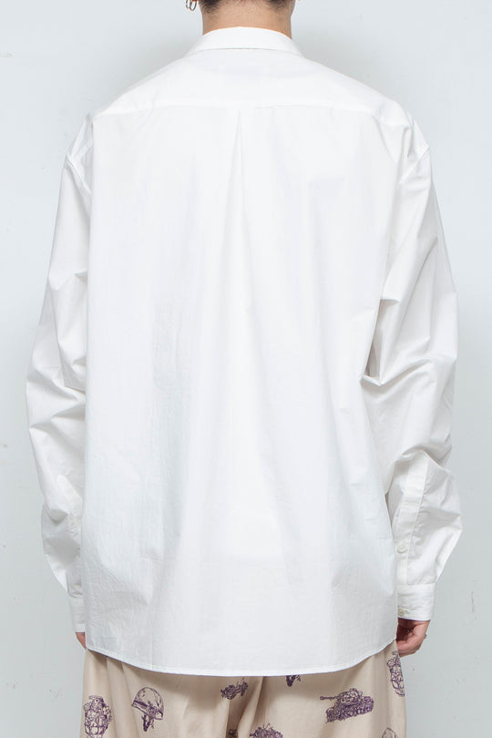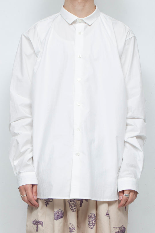 Since I started making clothes, I have dismantled various shirts and researched their structures, and have created simple shirts with smaller collars and cuffs based on what appeals to me about each shirt. Made of 100% cotton typewriter 80S fabric, the buttons are made of recycled shell buttons.