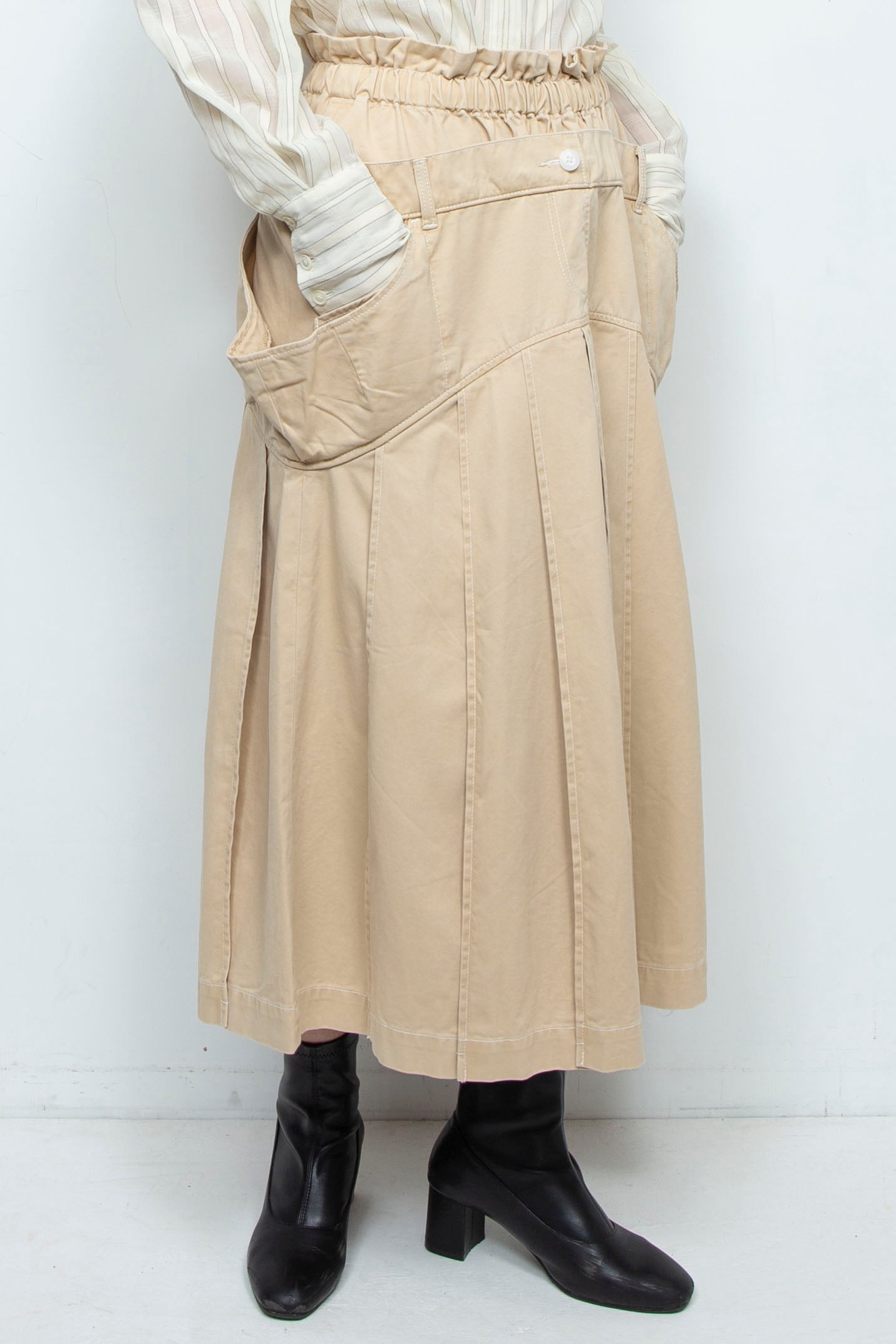 ロングの太幅プリーツスカートに太番手のステッチを施し、カジュアルな印象に仕上げた、日常で活躍するアイテム。