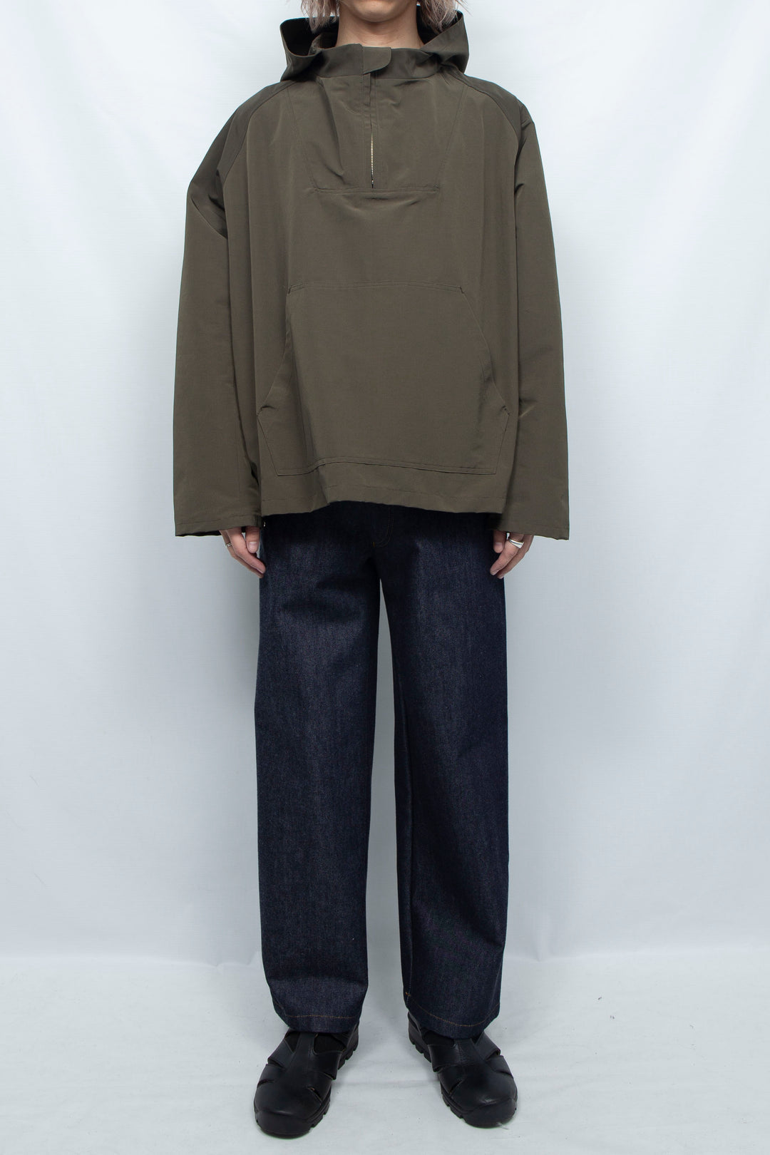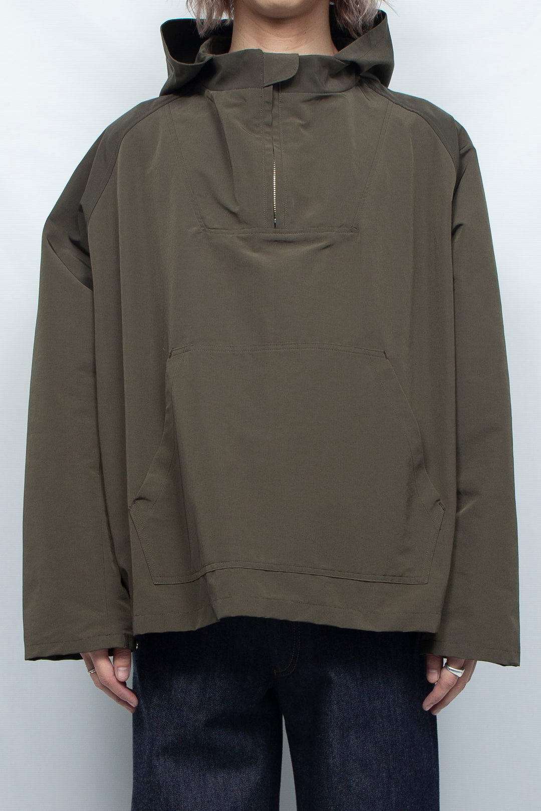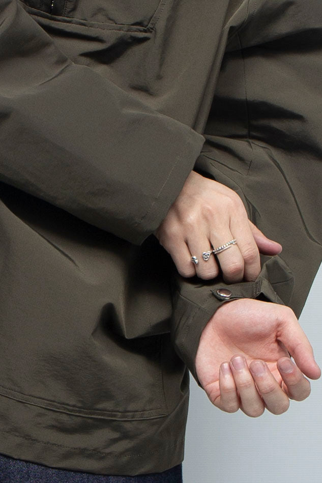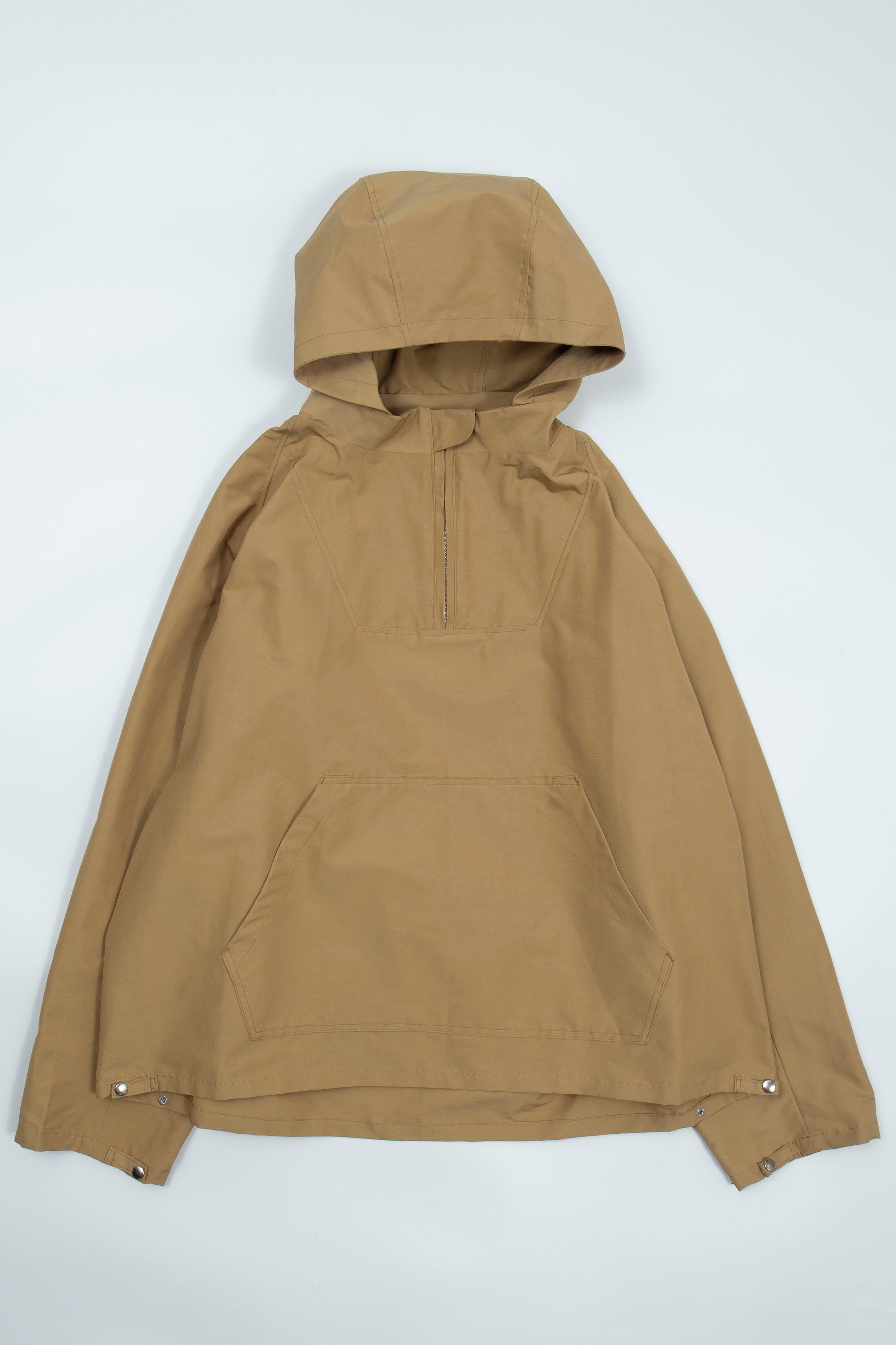 ハリのあるコットンナイロンを使用したハーフジップアノラックパーカー。袖と裾はスナップボタンで2段階のサイズ調整ができます。