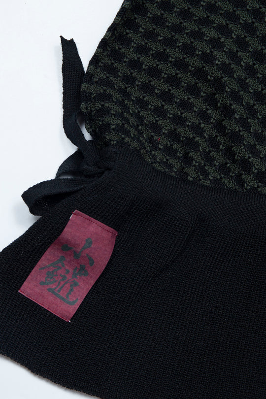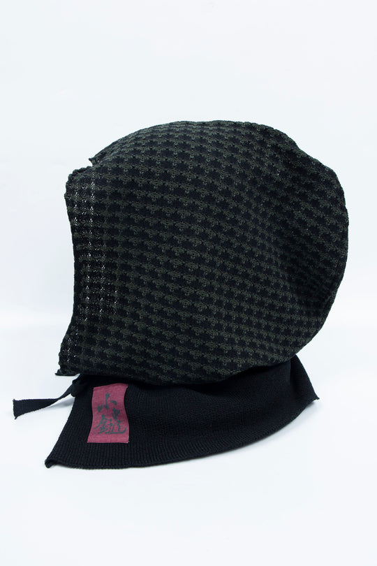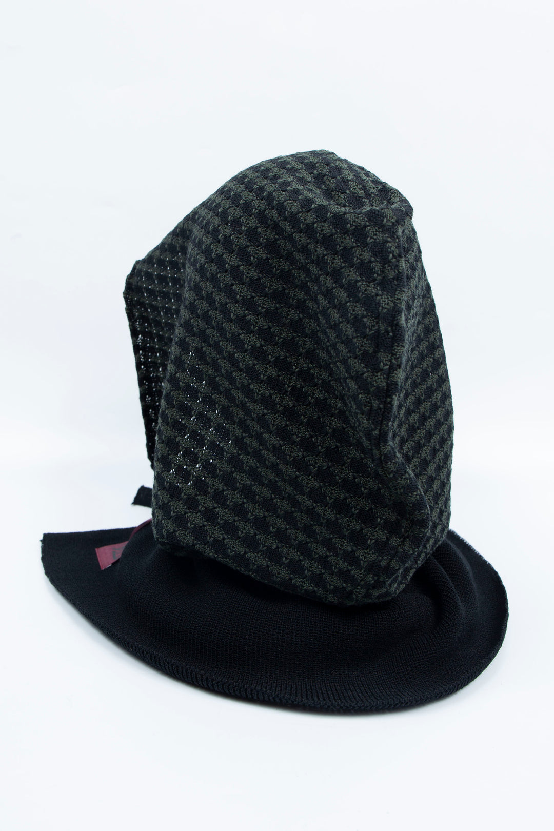 タートルネックセーターと共に着用しスタイリングの幅を広げる、和手帽子を参考に作製されたニットバラクラバ。
