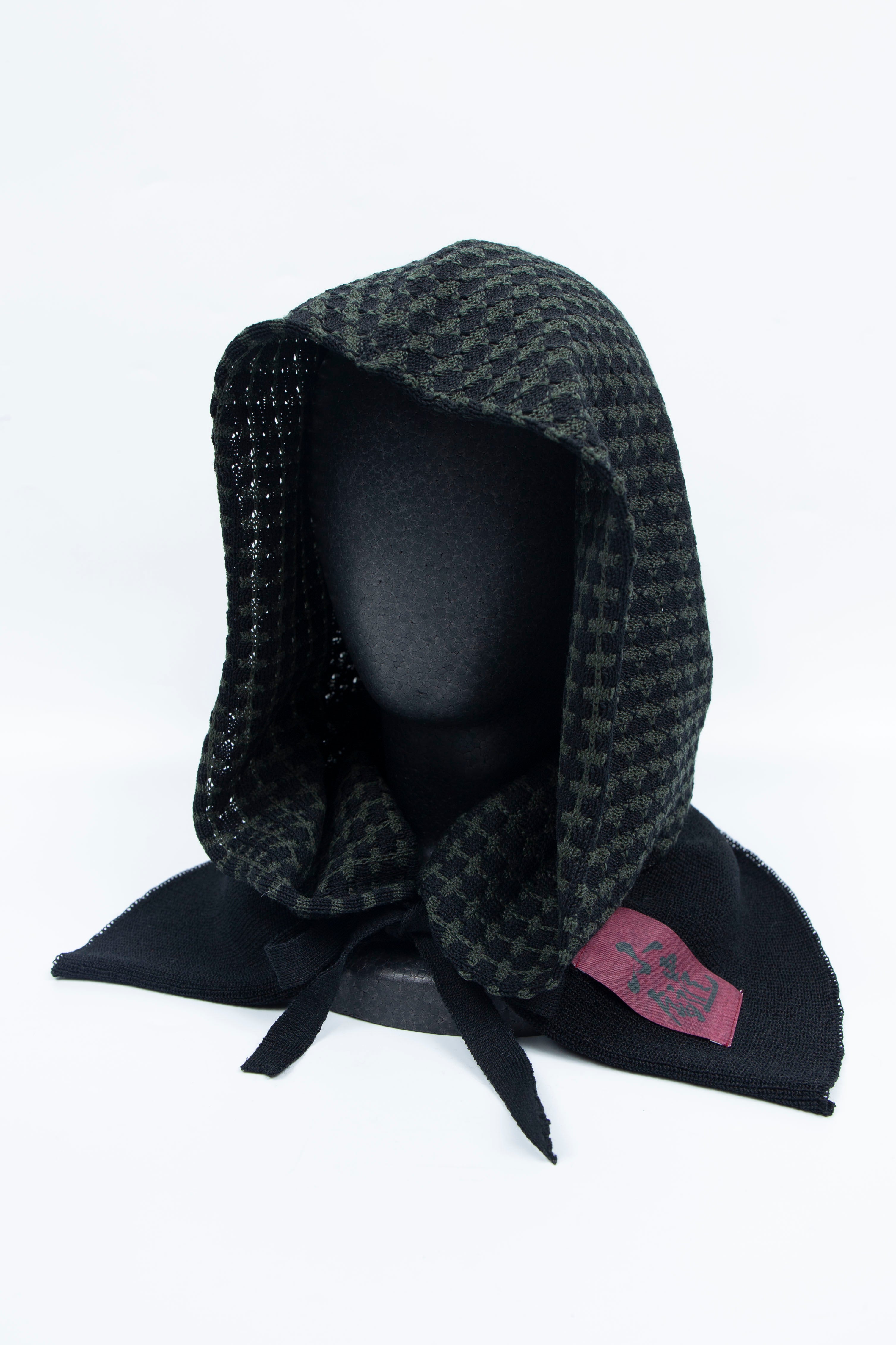 タートルネックセーターと共に着用しスタイリングの幅を広げる、和手帽子を参考に作製されたニットバラクラバ。