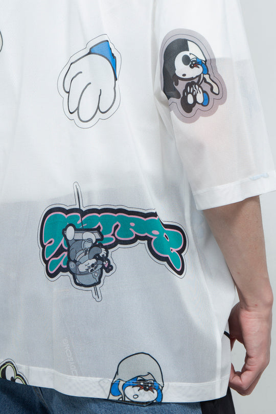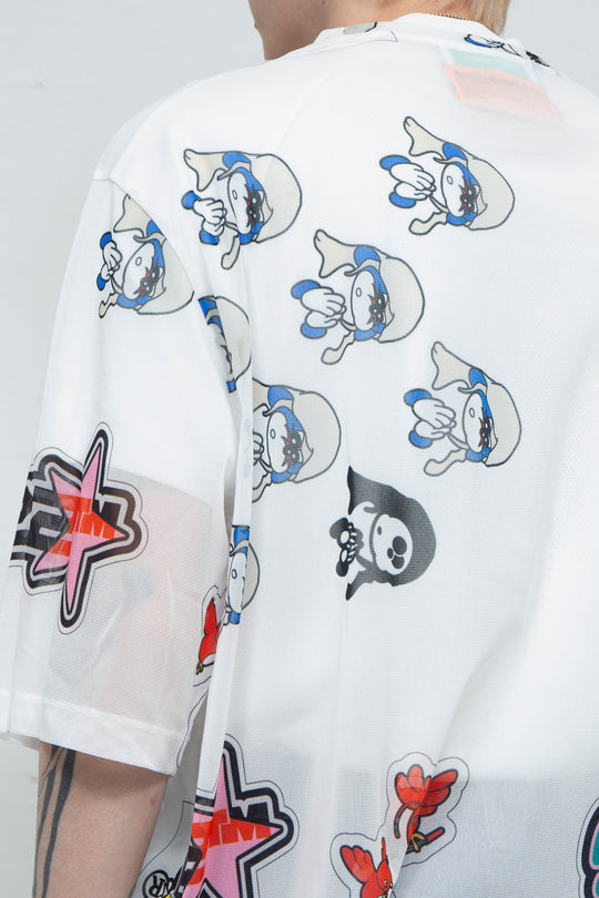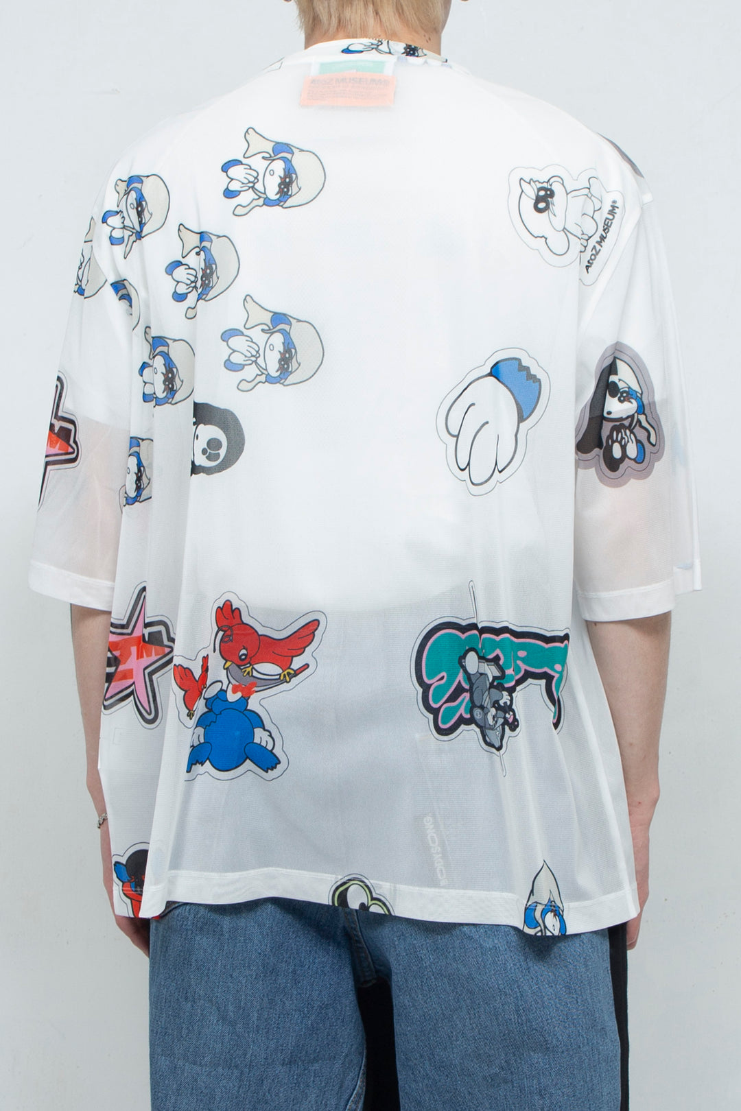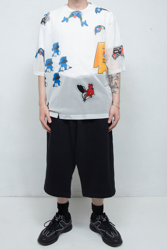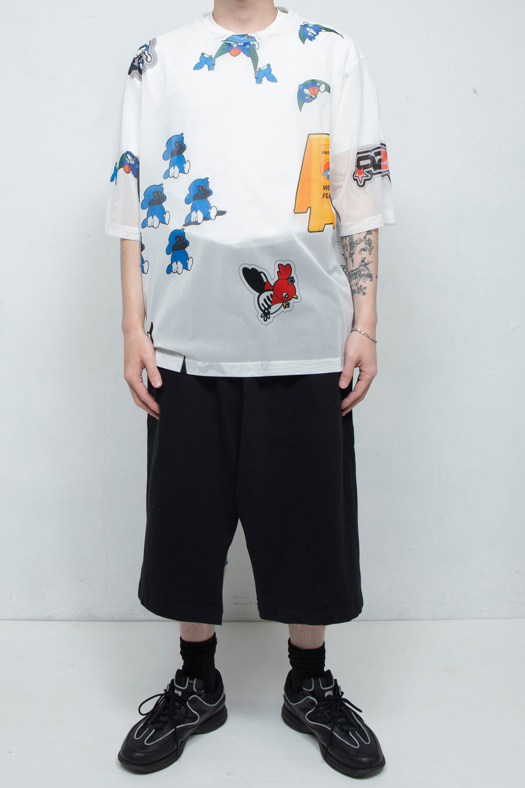 透けたメッシュ素材を使用したカットソー。現代アーティストAtoZとのコラボレーション柄。 A cut and sewn top made from sheer mesh fabric. The off-white version features flocky print. The orange and white versions features the print created in collaboration with contemporary artist AtoZ.