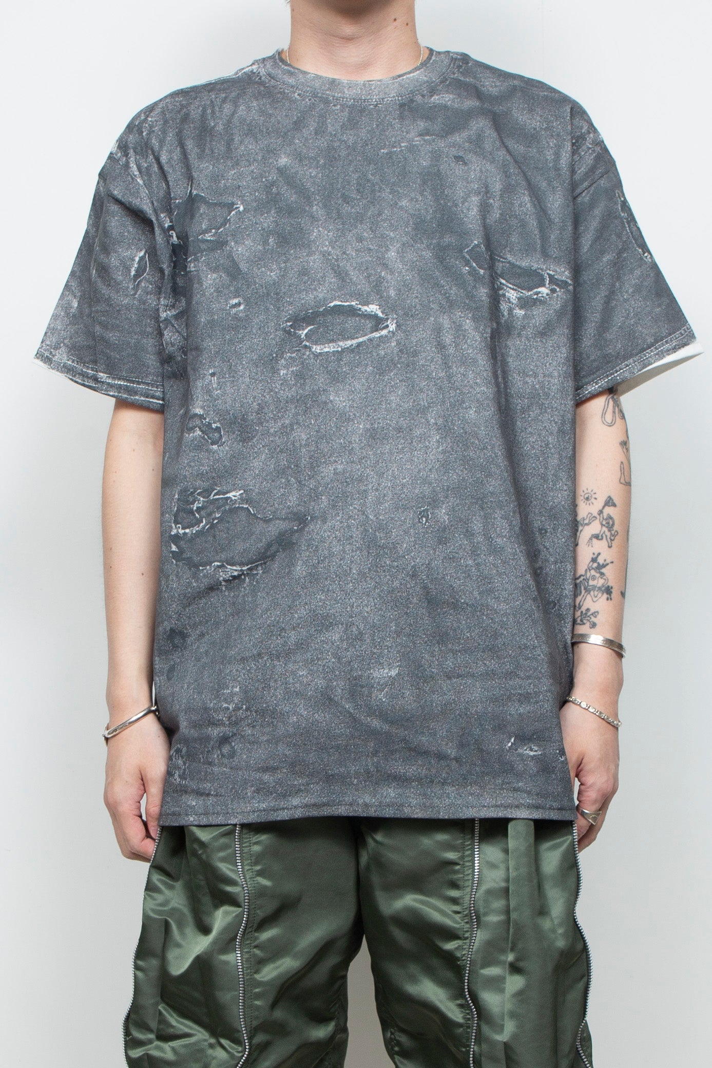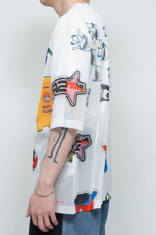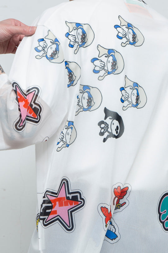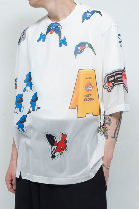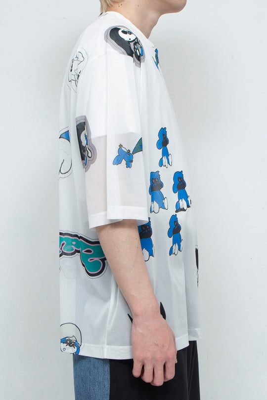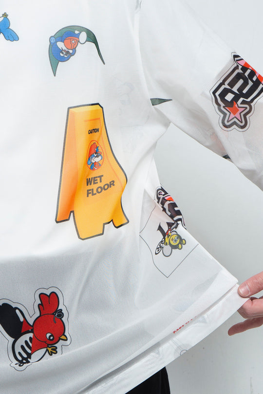 透けたメッシュ素材を使用したカットソー。現代アーティストAtoZとのコラボレーション柄。 A cut and sewn top made from sheer mesh fabric. The off-white version features flocky print. The orange and white versions features the print created in collaboration with contemporary artist AtoZ.