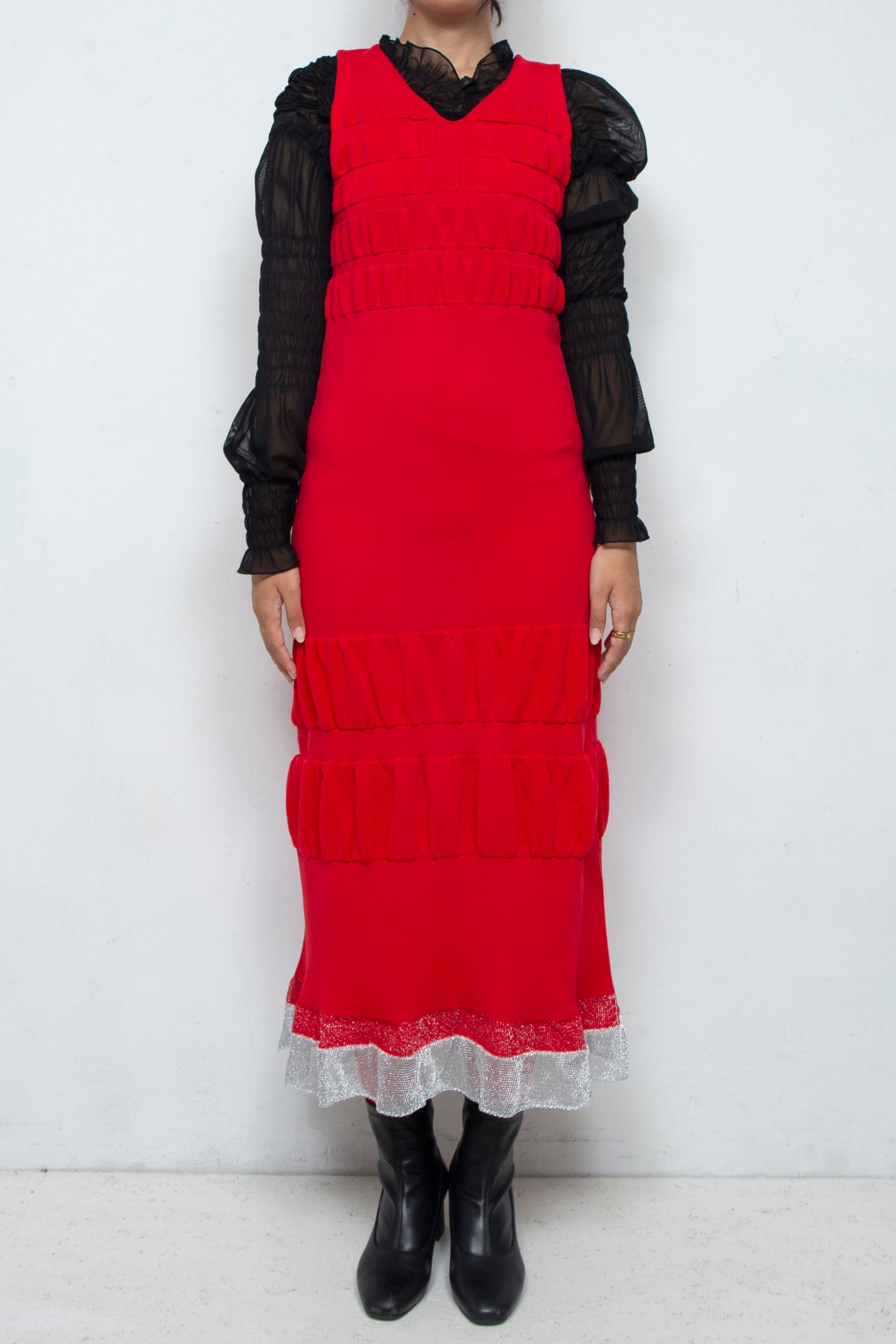 シルバーの裾やギャザーのようなデザインが特徴。