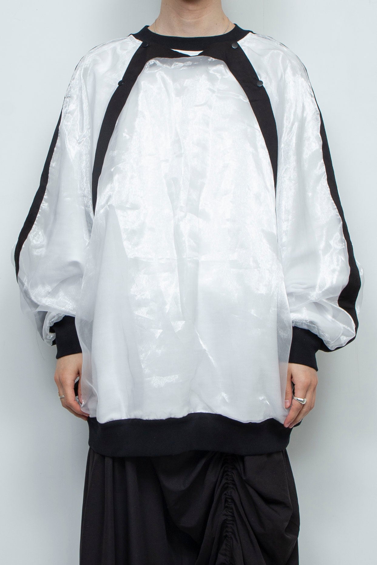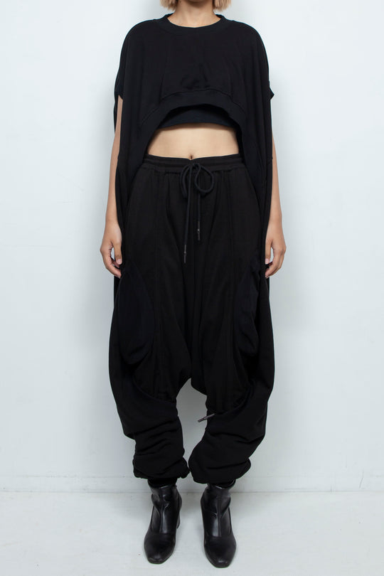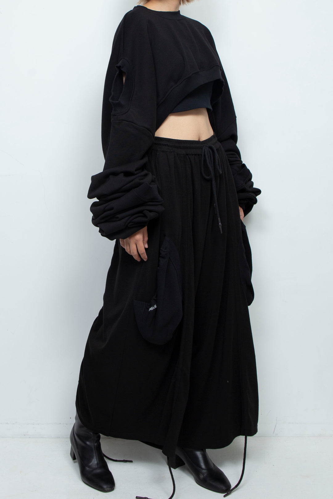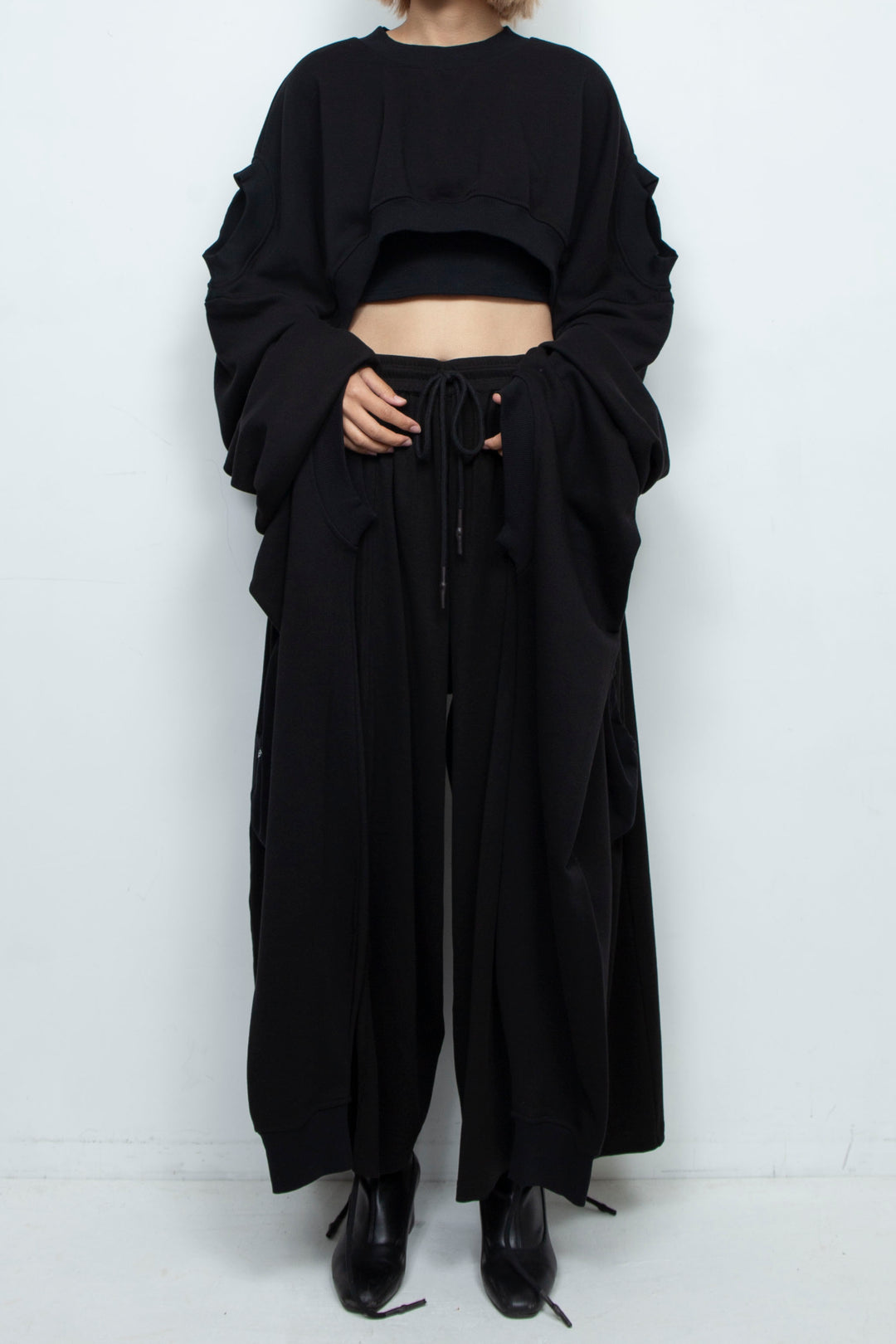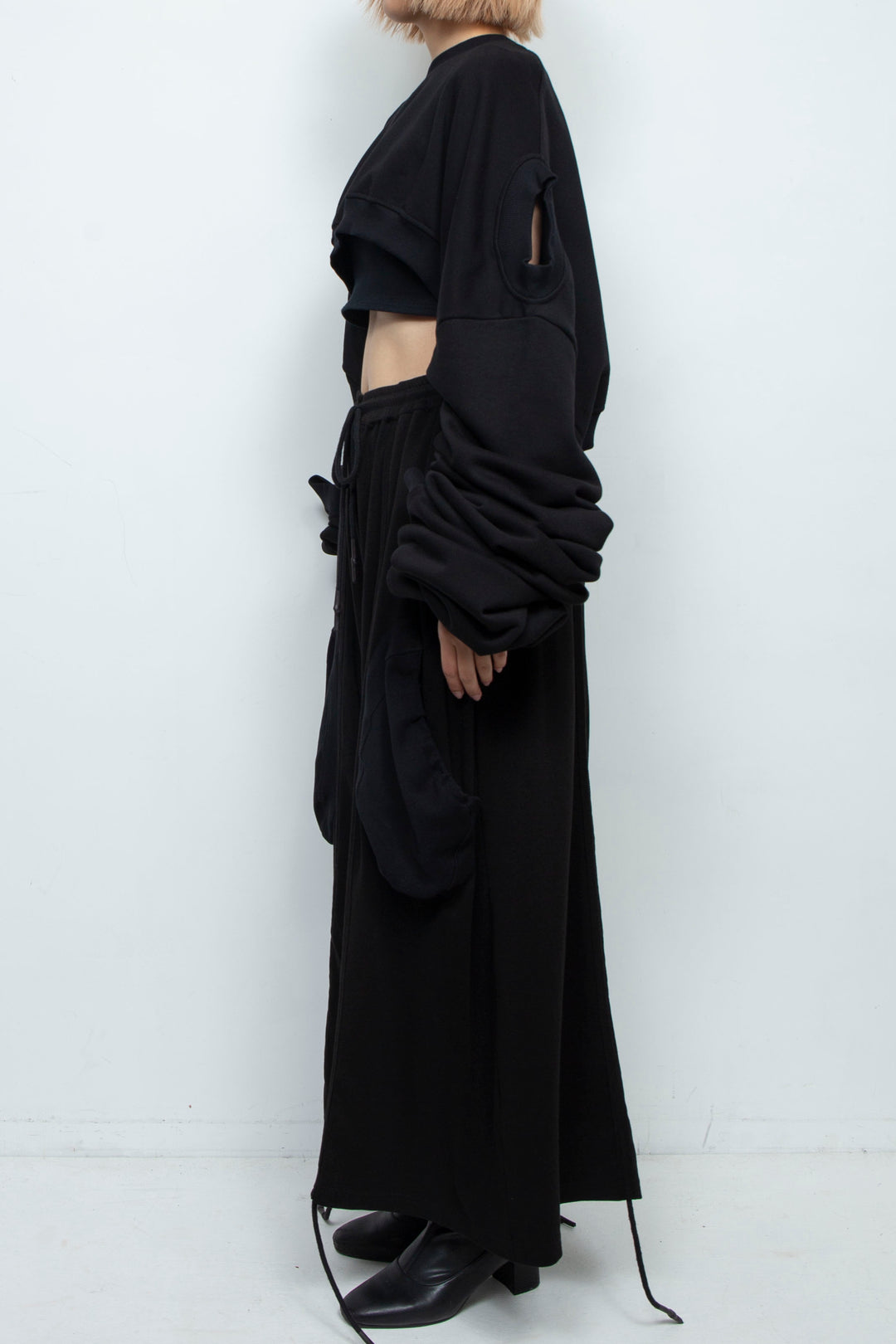 長めのドレープスリーブが特徴で、脚に羽織ってカットアウトジャンプスーツのような雰囲気に。