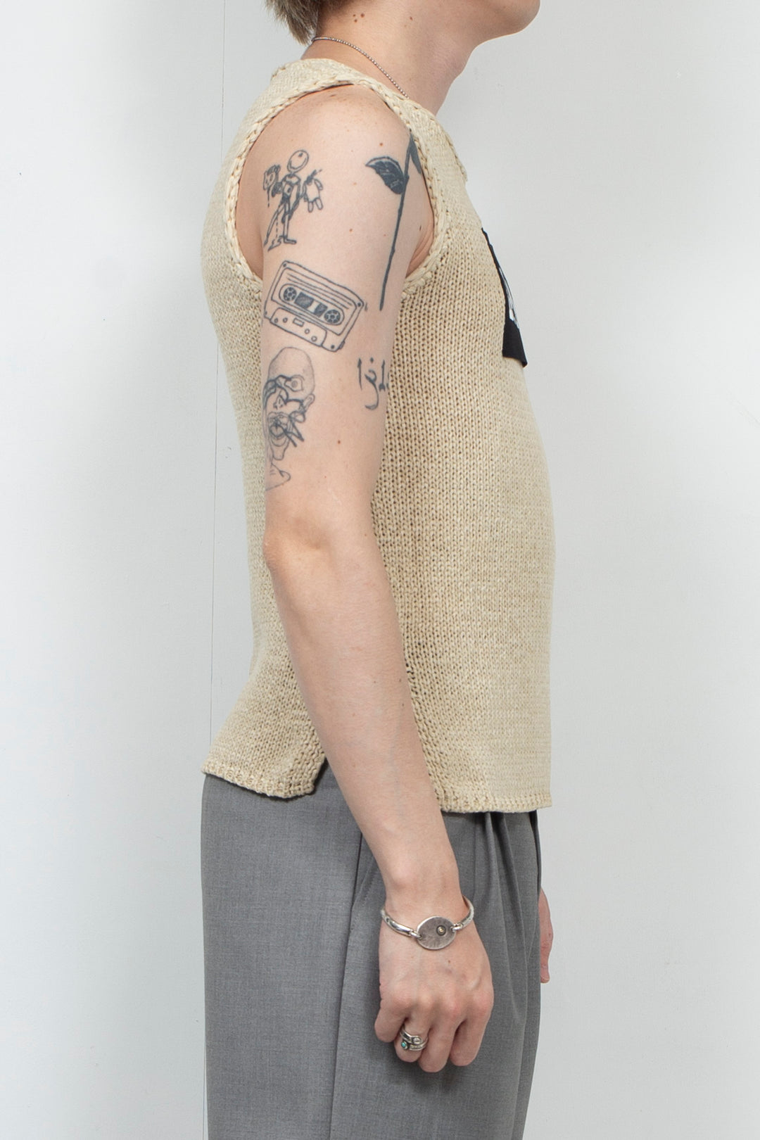 ハンドメイド特有のわずかな不規則性を意図的に残し、独特の質感に。胸元のBPM の文字は、切りっぱなしのエッジ処理でコントラストを生み出しています。